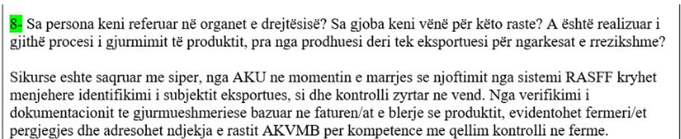 Në përgjigje AKU thotë se “bazuar në verifikimet e sistemit të gjurmueshmërisë në OBU të cilat kanë kryer eksporte ku kanë rezultuar problematika në lidhje me mbetjet e pesticideve mbi norme, rezulton se këto Operator i Biznesit Ushqimor nuk tregtojnë në tregun vendas, pasi punojnë vetëm për eksport”.