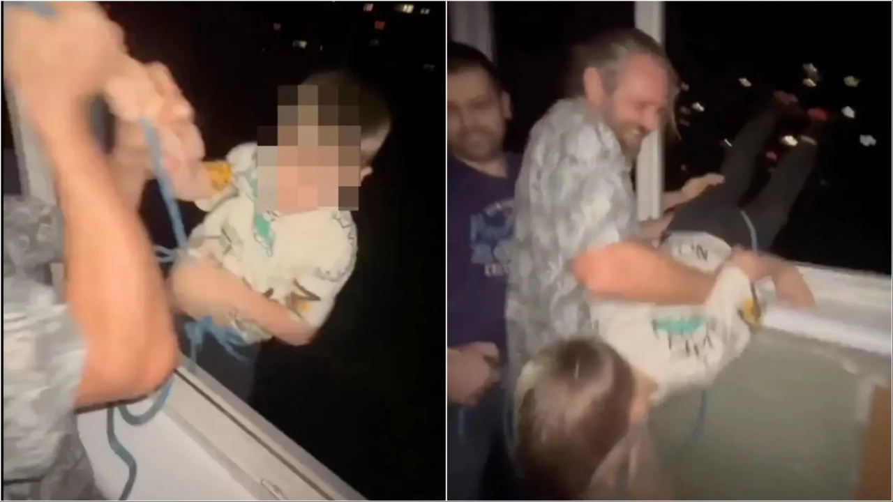 Ngjarja raportohet të ketë ndodhur në qytetin e Voronezhit, ku babai i fëmijës së mitur 5-6 vjeçar shfaqet duke qeshur me shokët teksa nis të zbresë me litar djalin e tij.