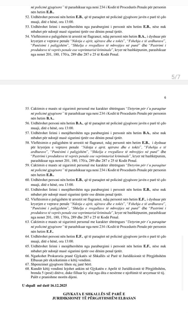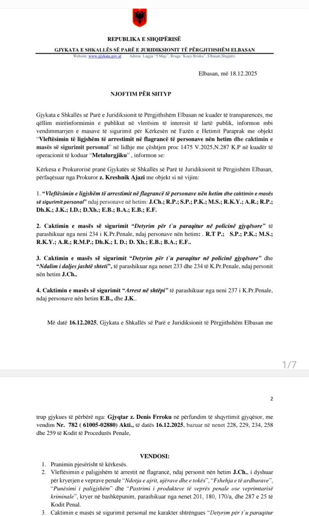 Në komunikatën zyrtare gjykata e Elbasanit bën me dije se gjyqtari i çështjes Denis Frroku ka rrëzuar kërkesën e Prokurorisë së Elbasanit për vlerësimin të ligjshëm të arrestit të 16 personave (9 shtetas të huaj) për dosjen Metalurgjiku dhe ka pranuar masën e detyrim paraqitje për të gjithë.