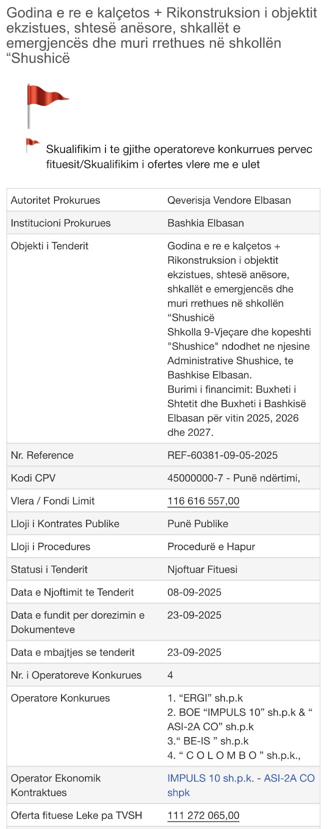 Tenderi u zhvillua më 23 shtator 2025, ndërsa njoftimi për fituesin u bë më 8 shtator, gjë që, sipas praktikave standarde të prokurimeve, ngre gjithashtu pikëpyetje mbi rendin kronologjik të procesit.