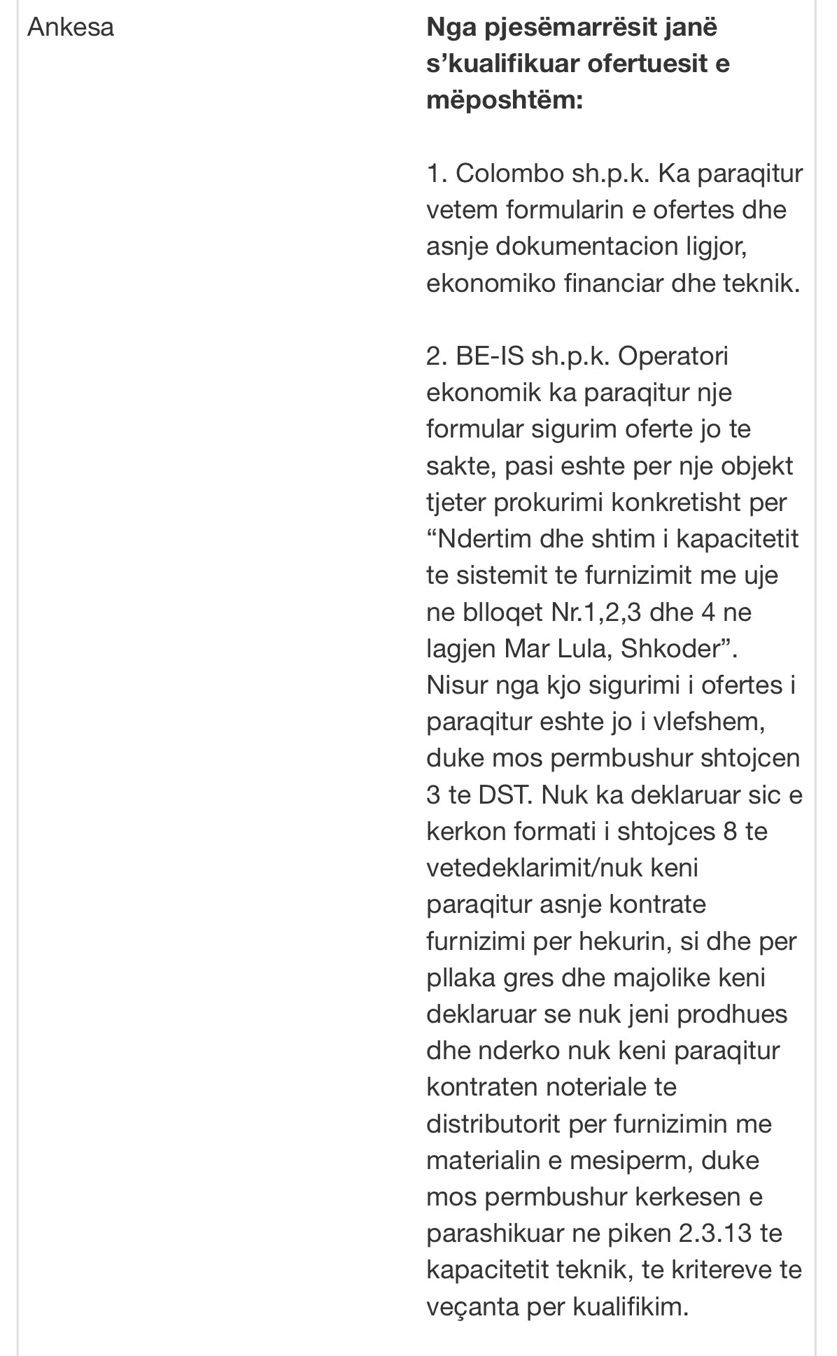 Një tjetër kompani, “COLOMBO sh.p.k.”, nuk kishte dorëzuar asnjë dokument financiar apo teknik, por vetëm formularin e ofertës.