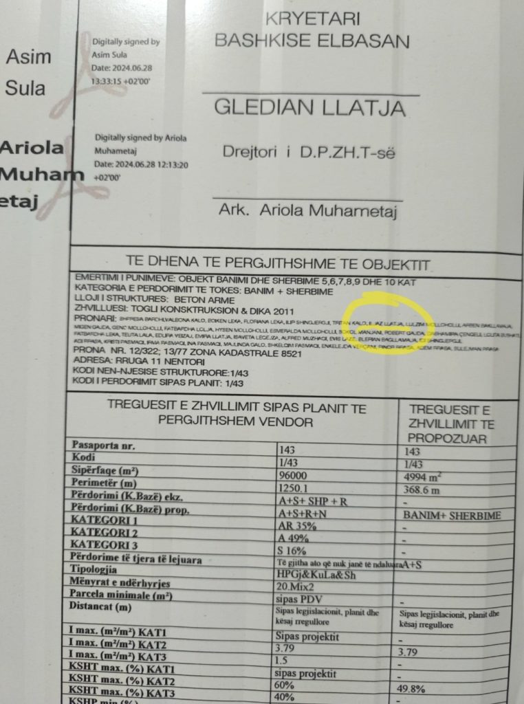 Kryetari i bashkisë Elbasan Llatja sipas informacioneve rezulton të ketë favorizuar taksën e ndikimit në infrastrukturë me një shifër rreth 80 milionë lek si dhe të ketë përshpejtuar pjesën e dokumentacionit të përcjellë ndaj AZHT, pasi në këtë zonë, në bazë të planit rregullues nuk lejoheshin ndërtime shumëkatëshe.