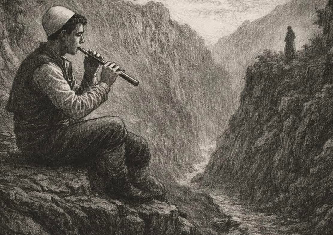 Mbrëmjeve, kur dielli zbriste pas kreshtave dhe hija e kanionit zgjatej si një plagë e errët mbi ujë, ajri mbushej me aromën e barit të njomë dhe të gurit të ftohtë. Atëherë bariu zbriste pranë shtratit të ngushtë të lumit dhe, i ulur mbi një shkëmb të lëmuar nga koha, nxirrte fyellin. Tingulli i tij ngrihej ngadalë, përhapej mes mureve të larta shkëmbore dhe kthehej jehonë, sikur vetë mali ta përsëriste me mall.