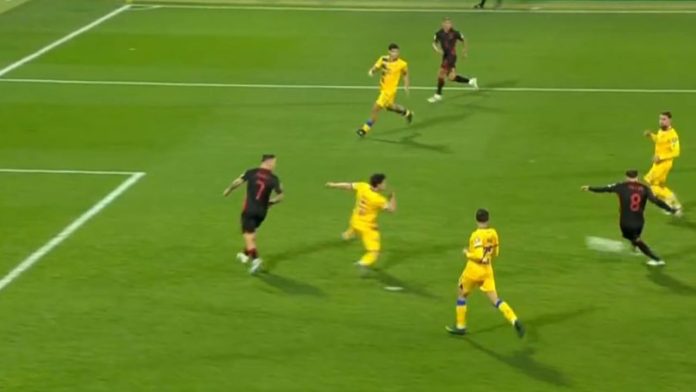 58′ Laçi hedh një krosim në zonë dhe Manaj mbahet nga mbrojtësi kundërshtar, por arbitri akordon faull për vendasit pas një prekje me dorë të sulmuesit shqiptar.