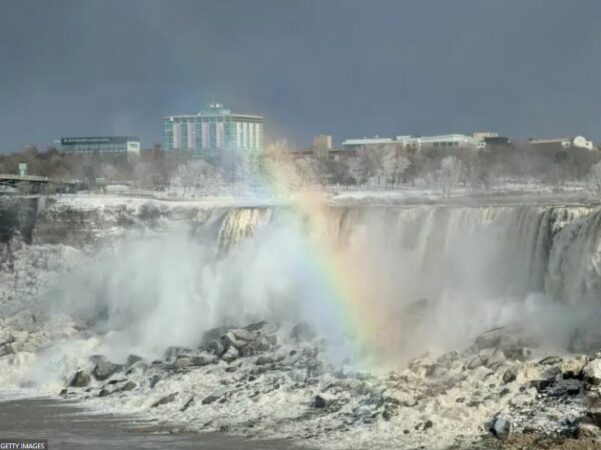 Një skenë e mahnitshme vjen nga Ujëvara e Niagarës, ku ajri i ftohtë ka krijuar një kombinim unik të akullit, avullit dhe ujit. Ujëvarat, të vendosura në kufirin SHBA-Kanada, janë ngrirë pjesërisht, duke formuar një spektakël që të lë pa frymë.